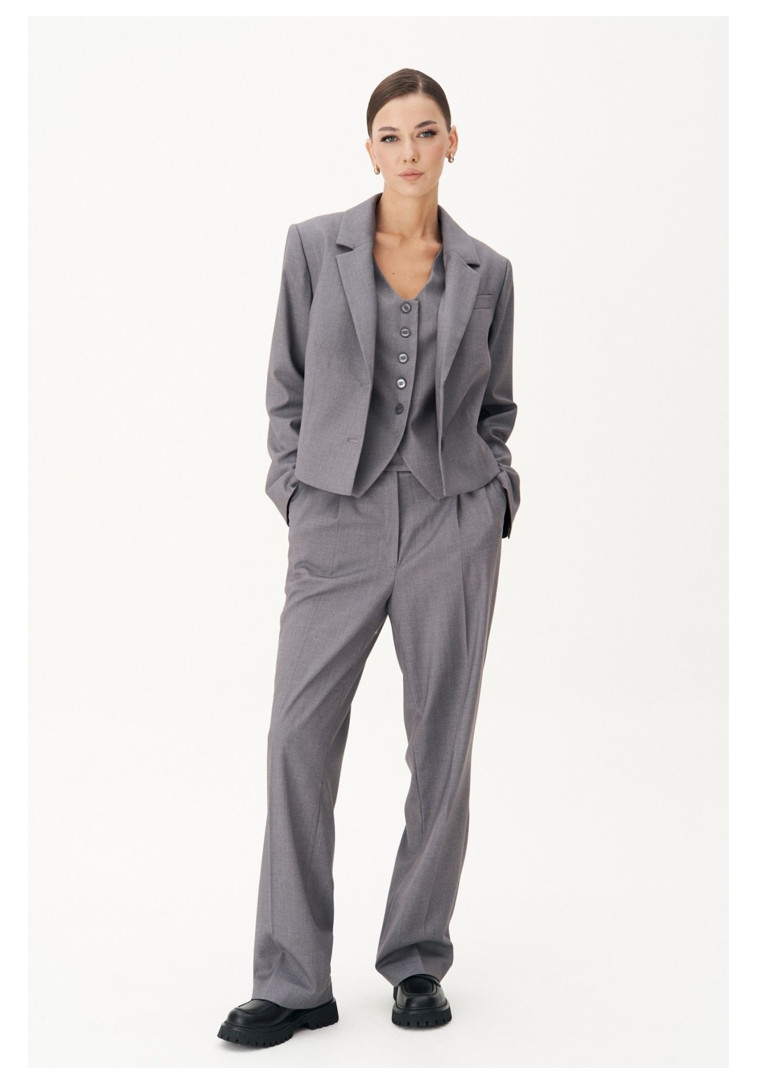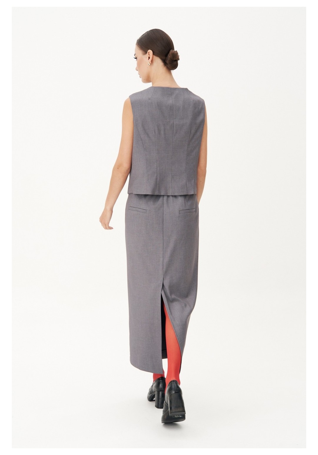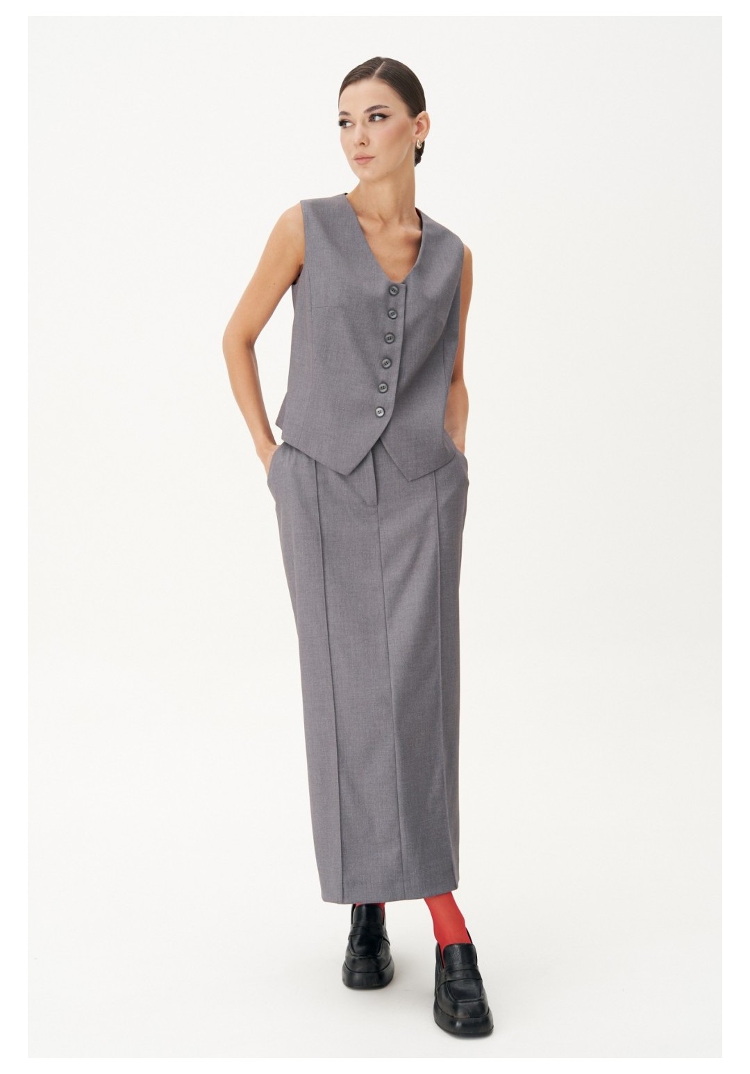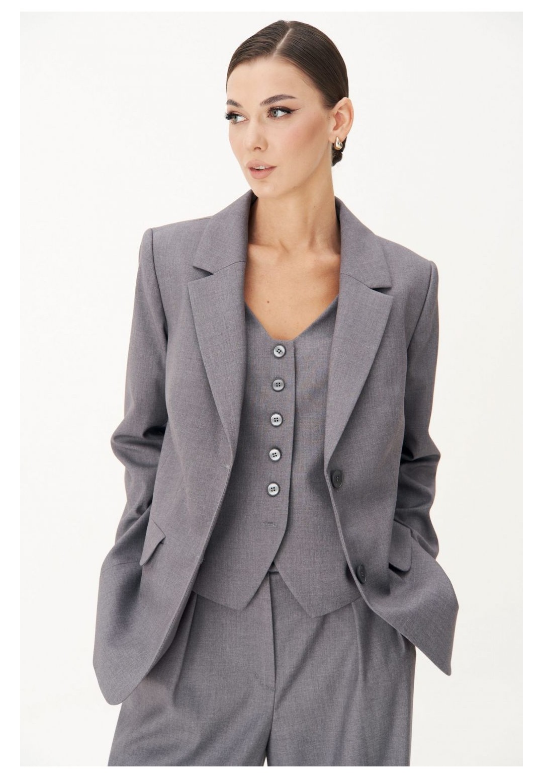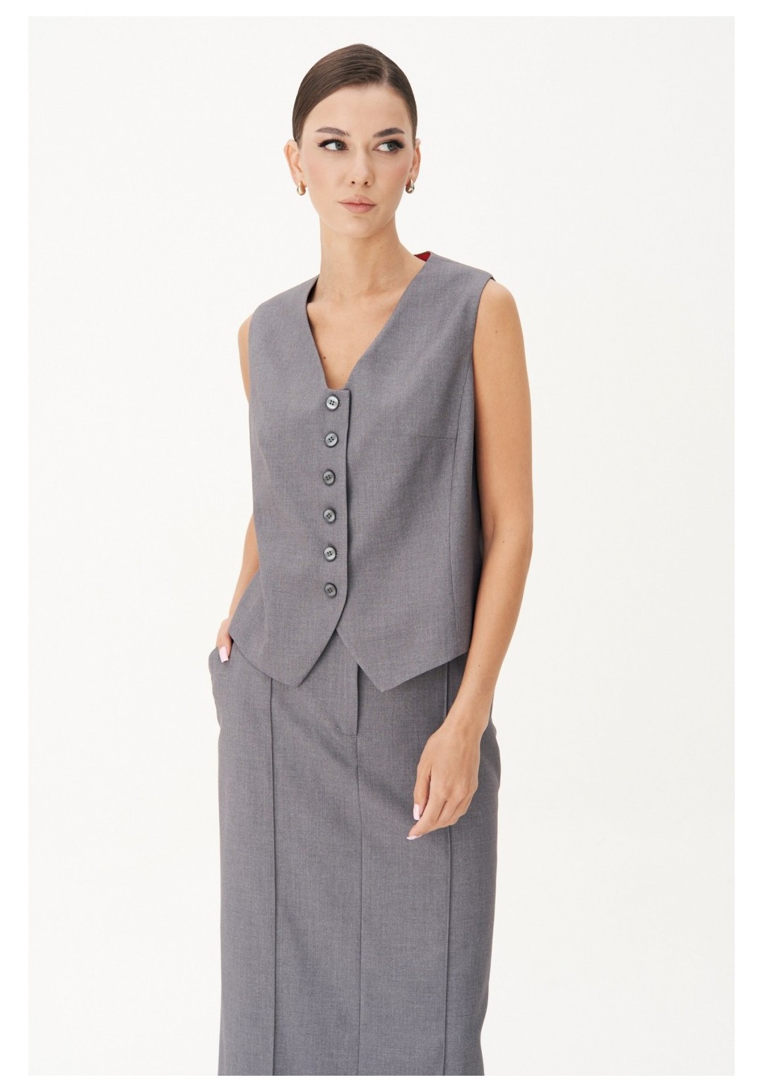 Жилет классический, полуприлегающего силуэта с центральной застёжкой, фигурным бортом и V-образным вырезом. Полочка с отрезным бочком и нагрудной вытачкой. Спинка с центральным швом, отрезным бочком, талиевой и плечевой вытачкой. Длина жилета около 50 см.