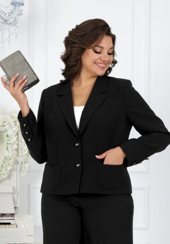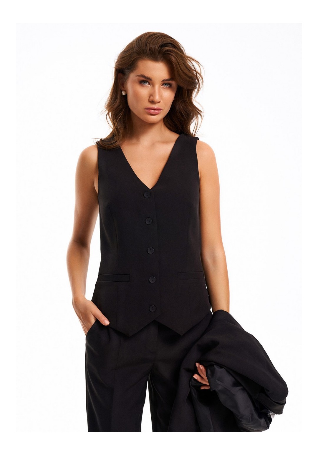 Жилетка женская умеренного объема полуприлегающего силуэта. Перед с талиевыми вытачками и имитацией карманов с листочкой. Спинка с талиевыми вытачками. Жилетка на притачной подкладке. Застежка центральная, на прорезные петли и пуговицы. Длина жилетки до уровня линии бедер. Длина - 68 см.