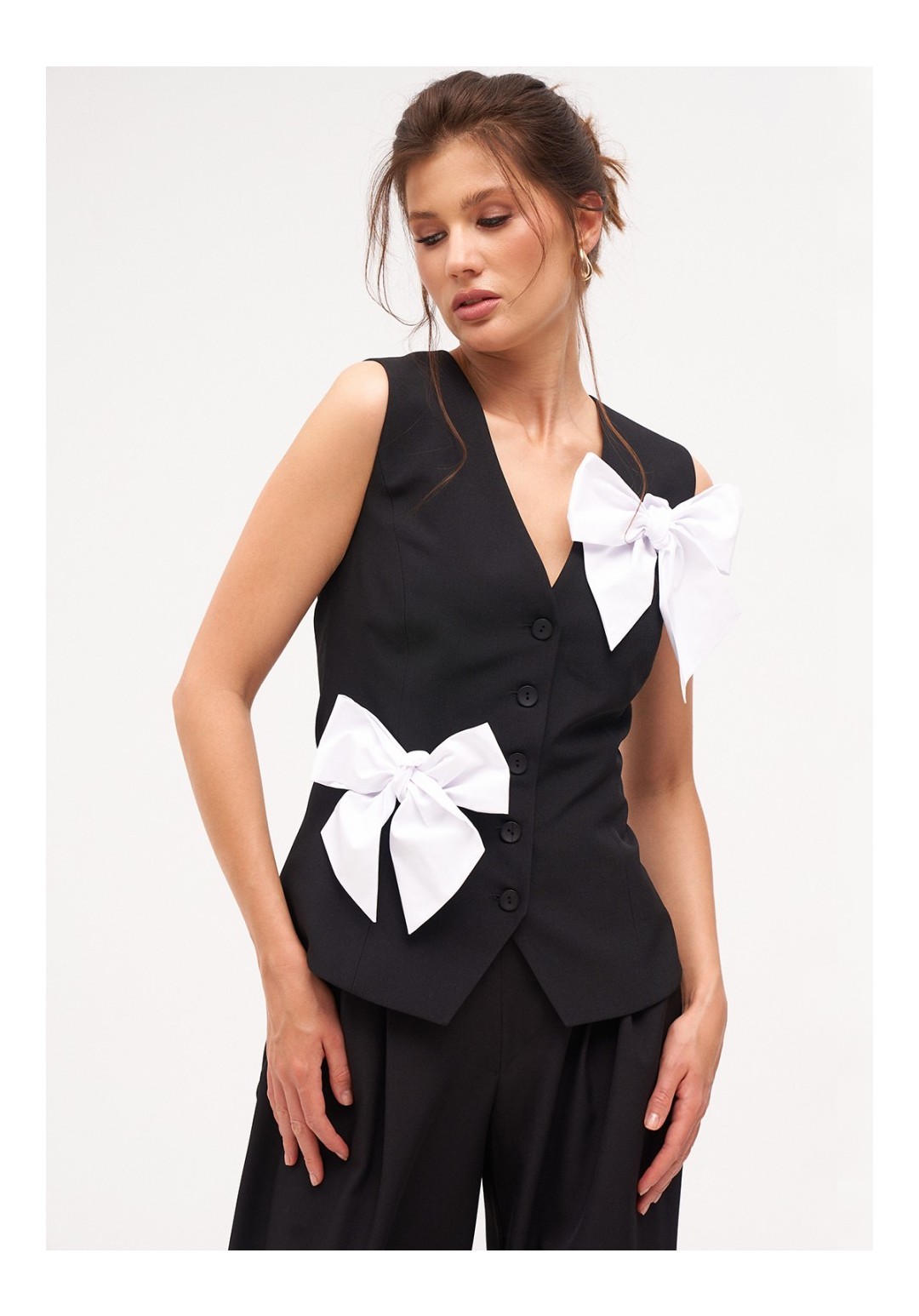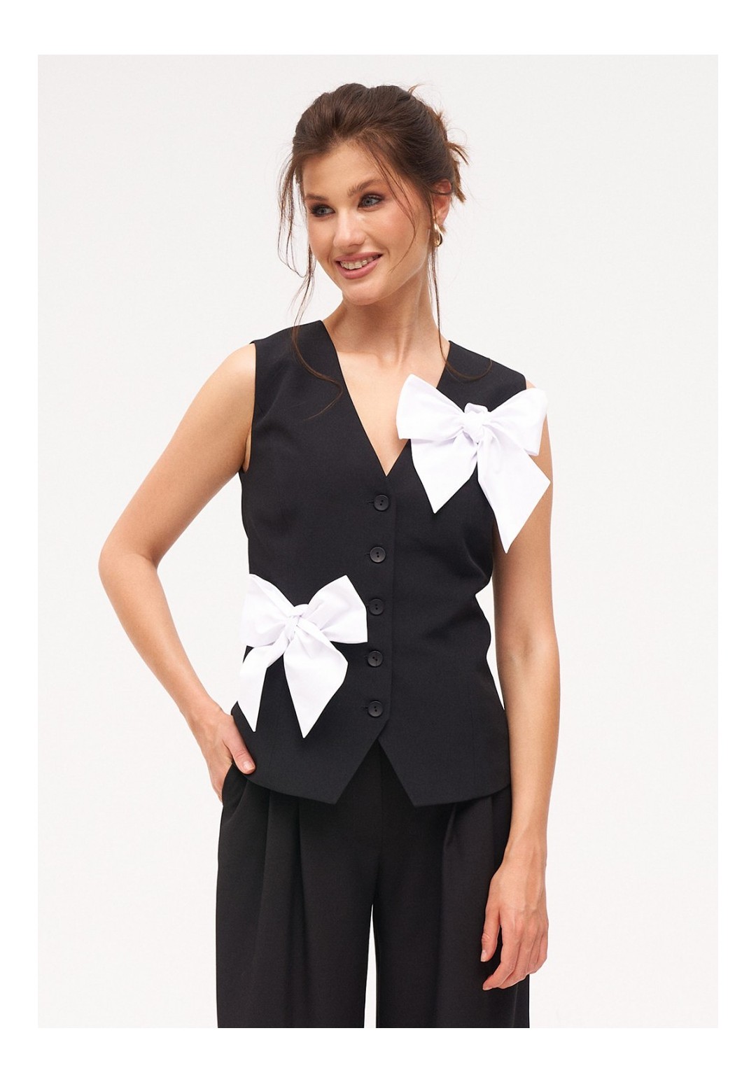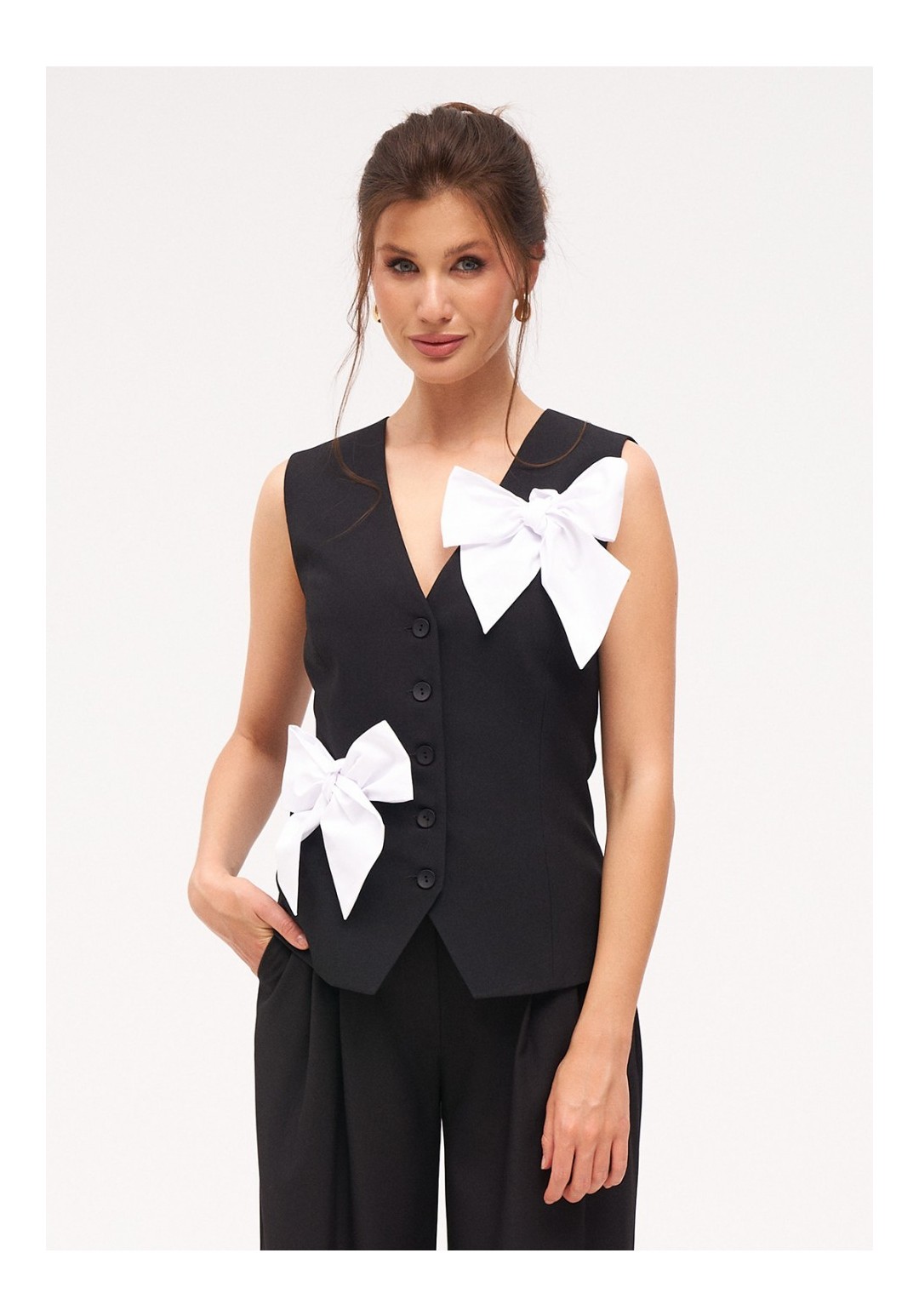 Жилетка женская умеренного объема полуприлегающего силуэта. Перед с талиевыми вытачками и имитацией карманов с листочкой. Спинка с талиевыми вытачками. Жилетка на притачной подкладке. Застежка центральная, на прорезные петли и пуговицы. Длина жилетки до уровня линии бедер. Декорируется съёмными, контрастными бантами.