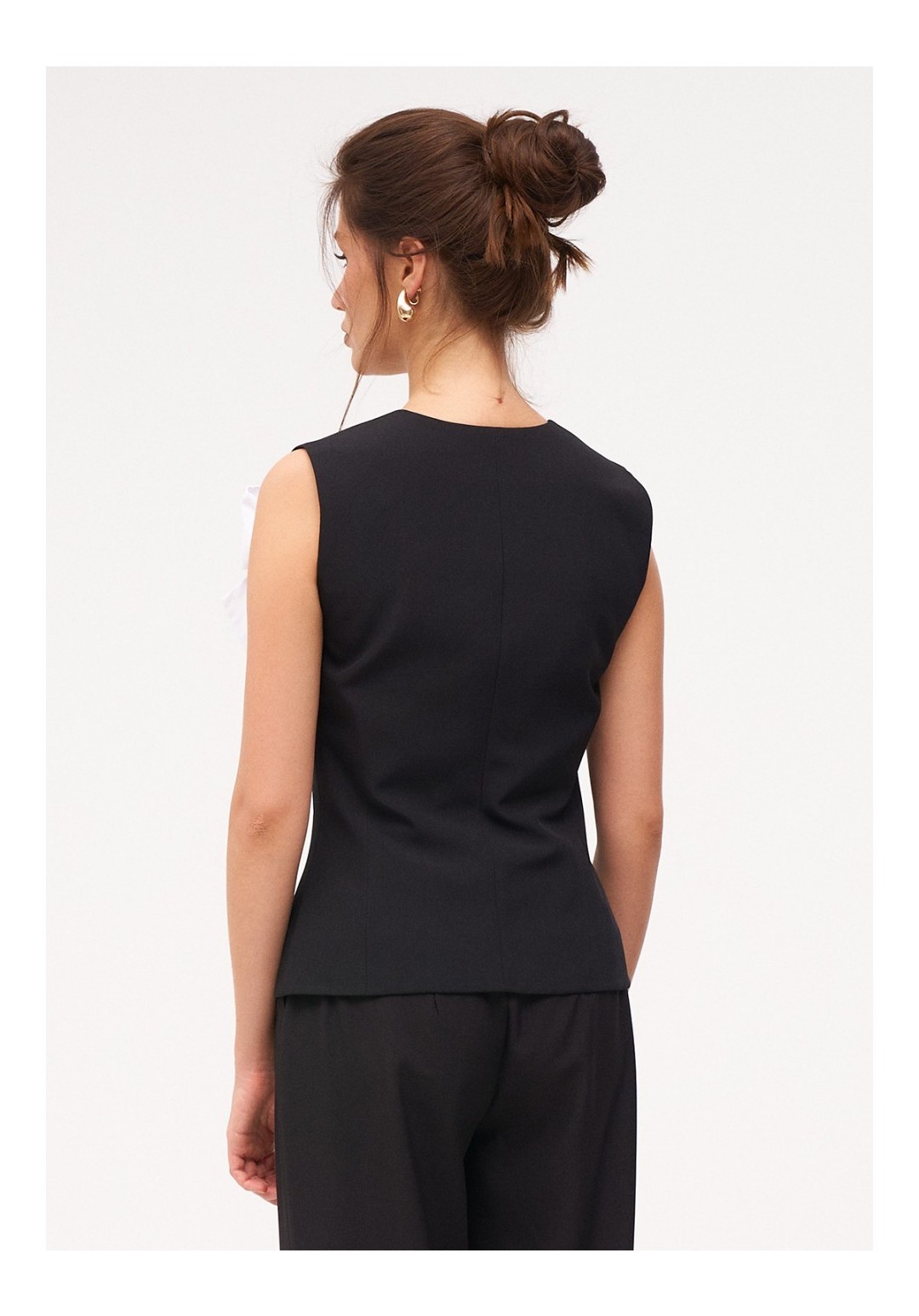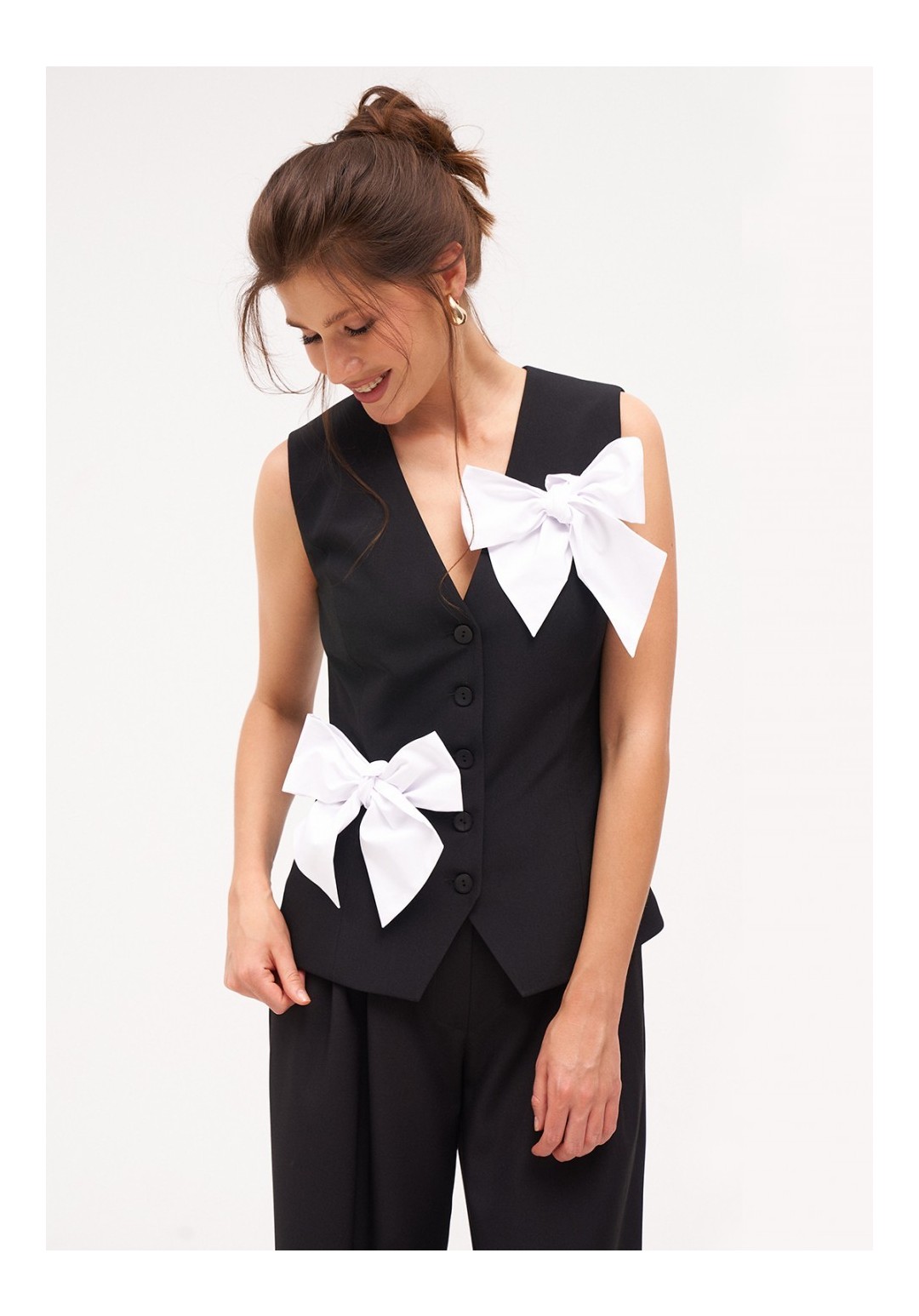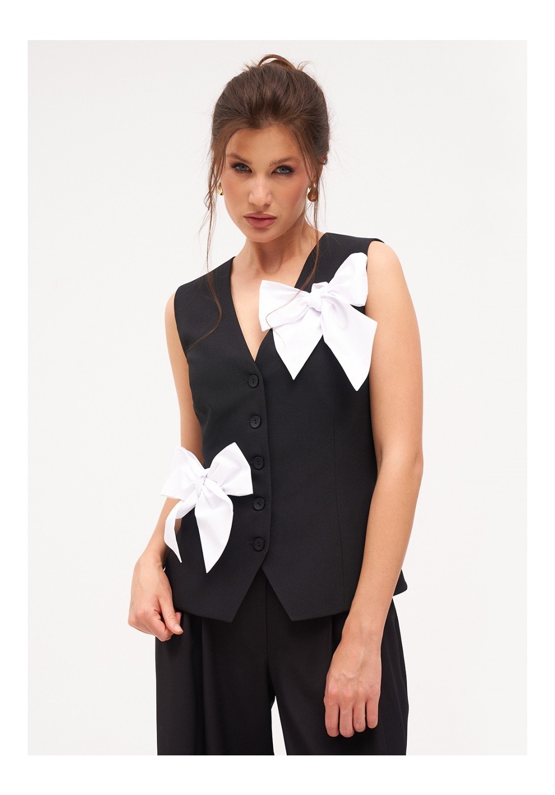 Жилетка женская умеренного объема полуприлегающего силуэта. Перед с талиевыми вытачками и имитацией карманов с листочкой. Спинка с талиевыми вытачками. Жилетка на притачной подкладке. Застежка центральная, на прорезные петли и пуговицы. Длина жилетки до уровня линии бедер. Декорируется съёмными, контрастными бантами.