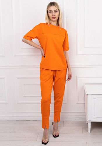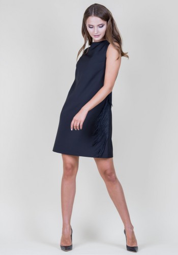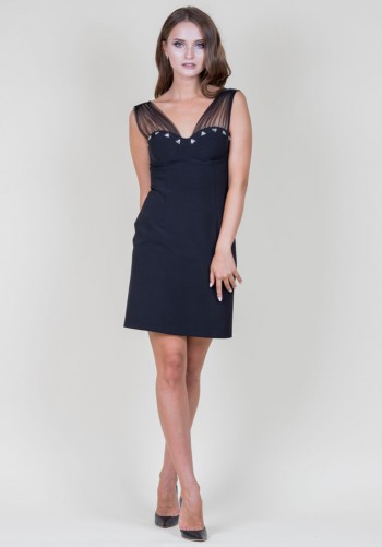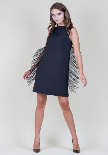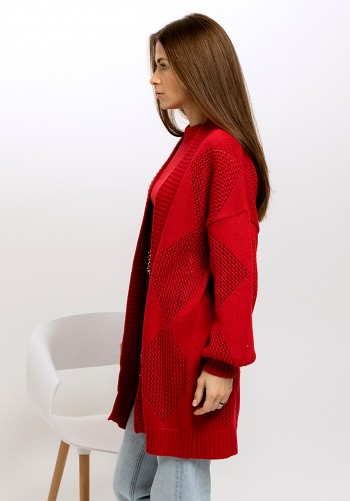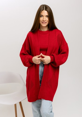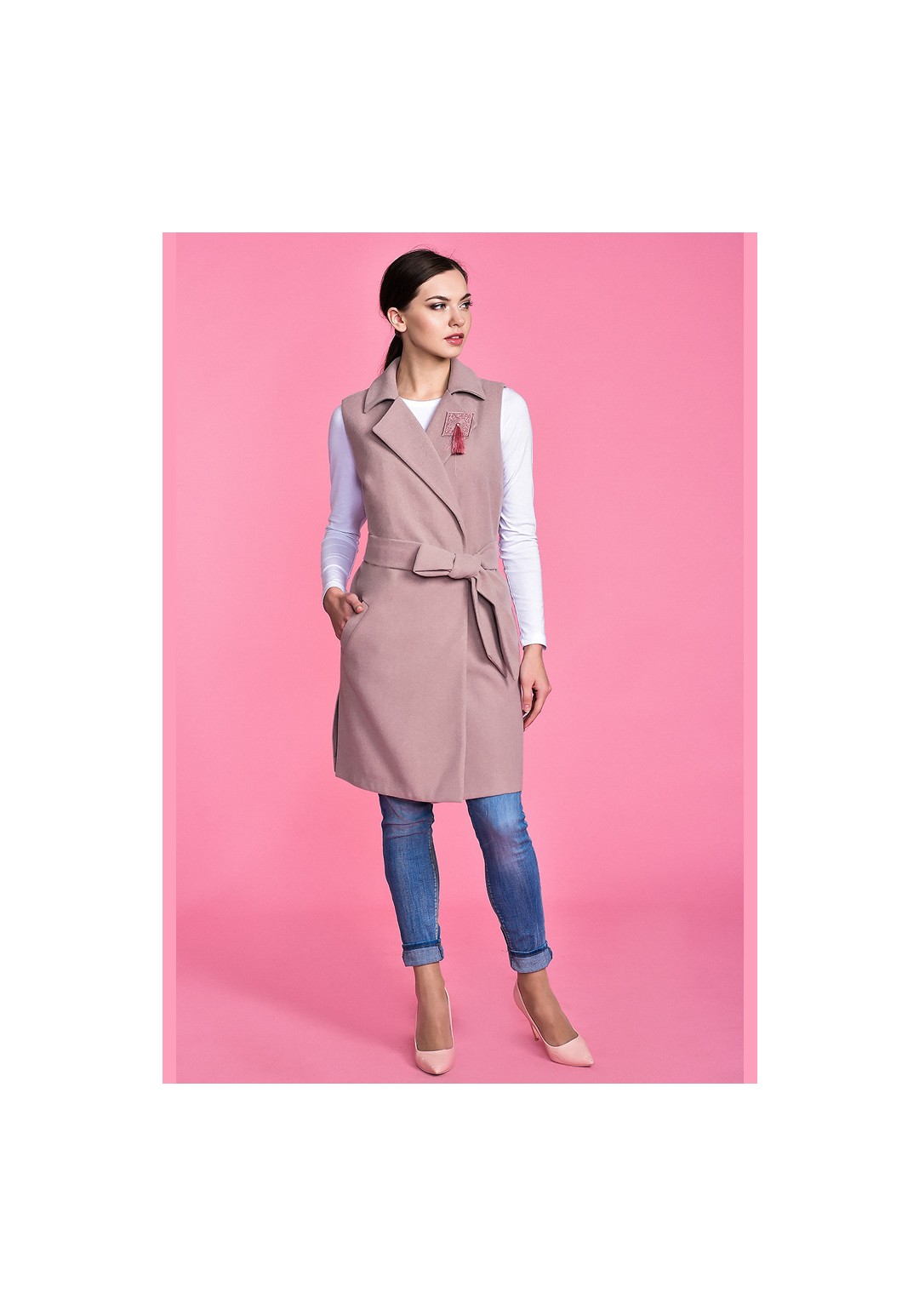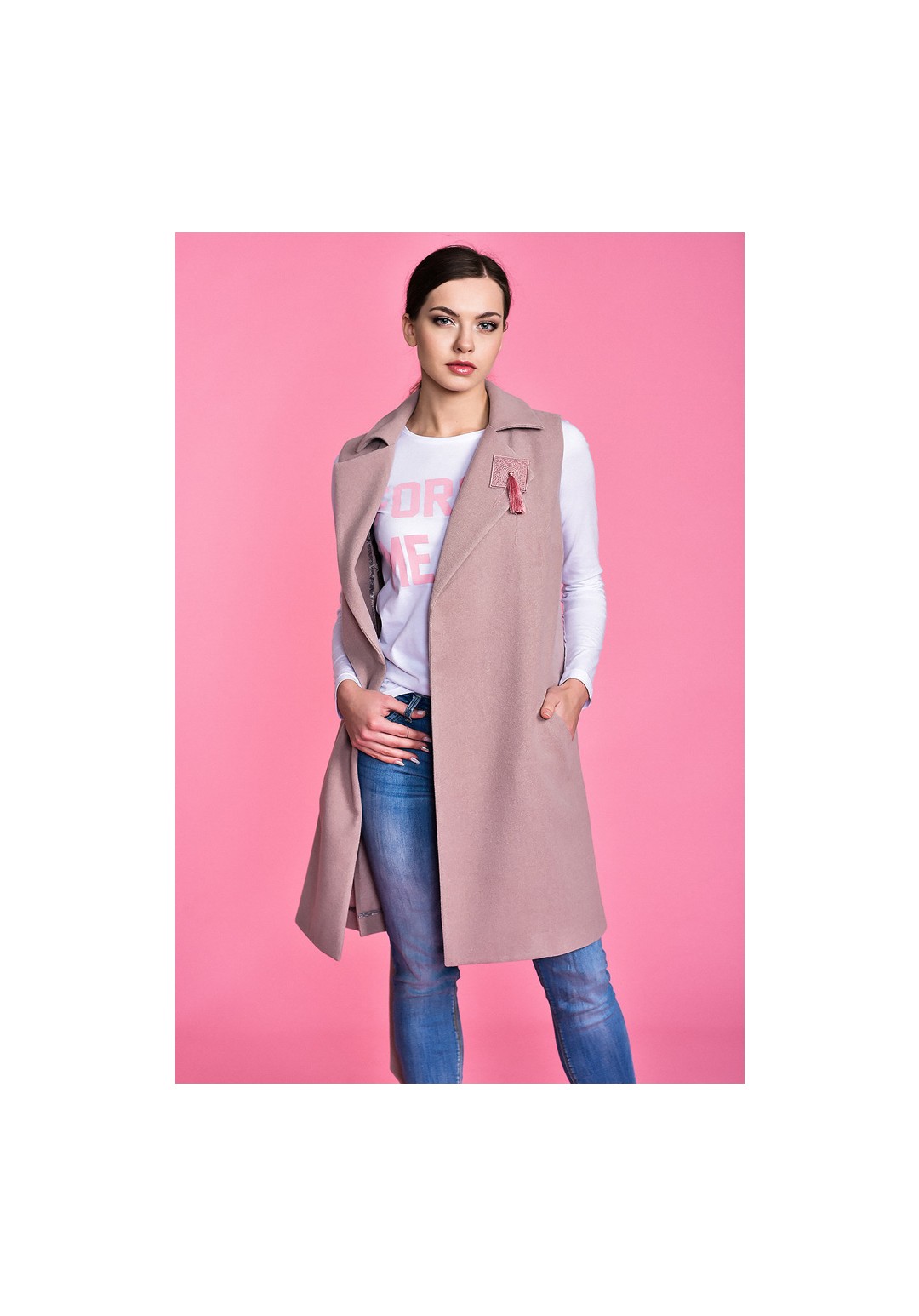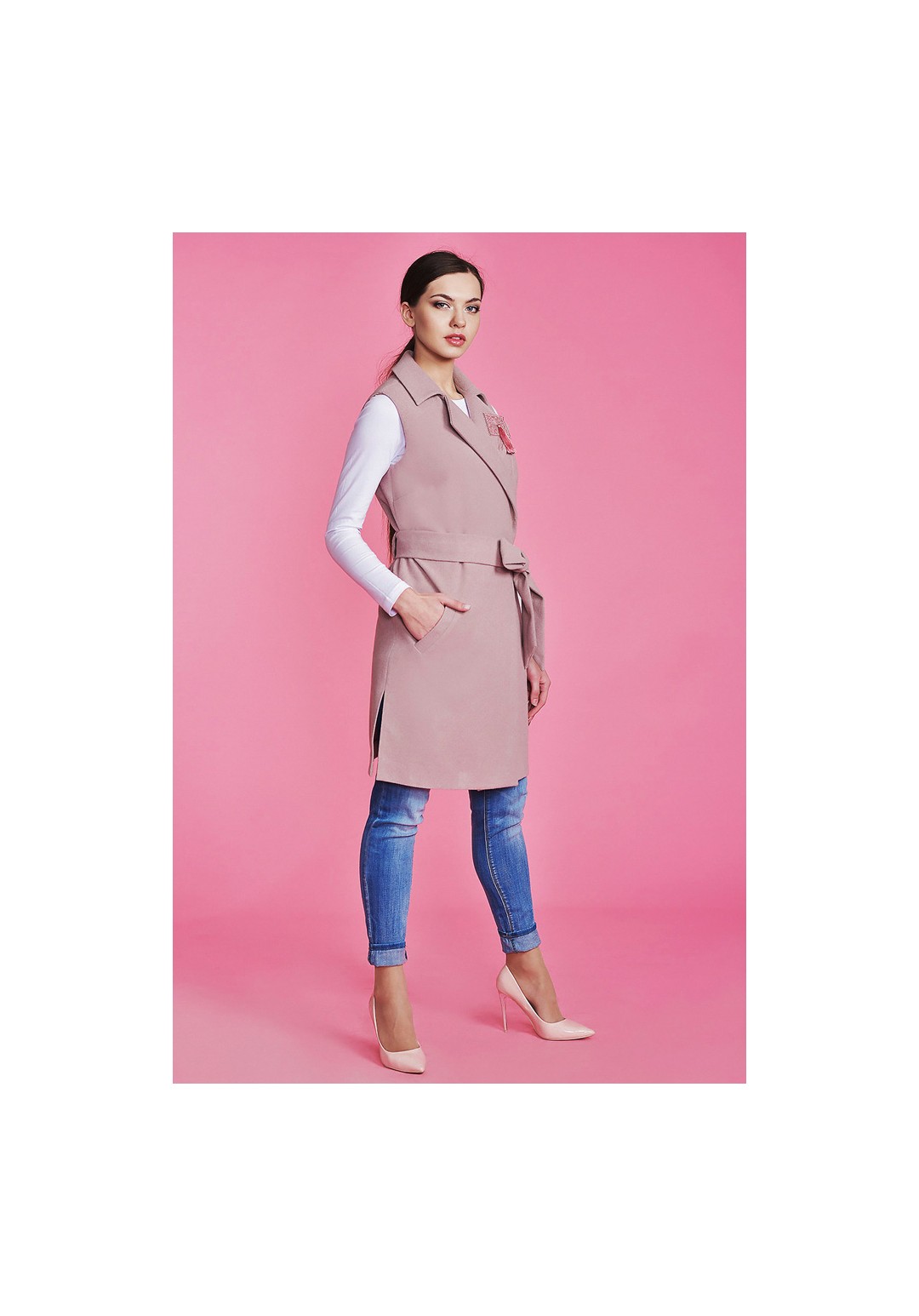 Жилет женский, удлиненный, повседневный, прямого силуэта, без застежки, двубортный, с поясом. Перед с боковыми вытачками, карманы с листочкой. Воротник пиджачного типа, украшен вышитым шевроном. Спинка с центральным швом и вытачками. В зоне талии - хлястик-тоннель, оформлен декоративной вышивкой. Жилет без подкладки. В боковых швах разрезы - 22 см.