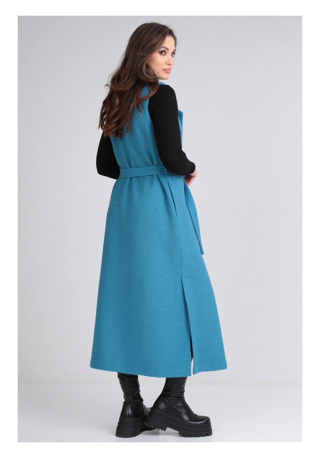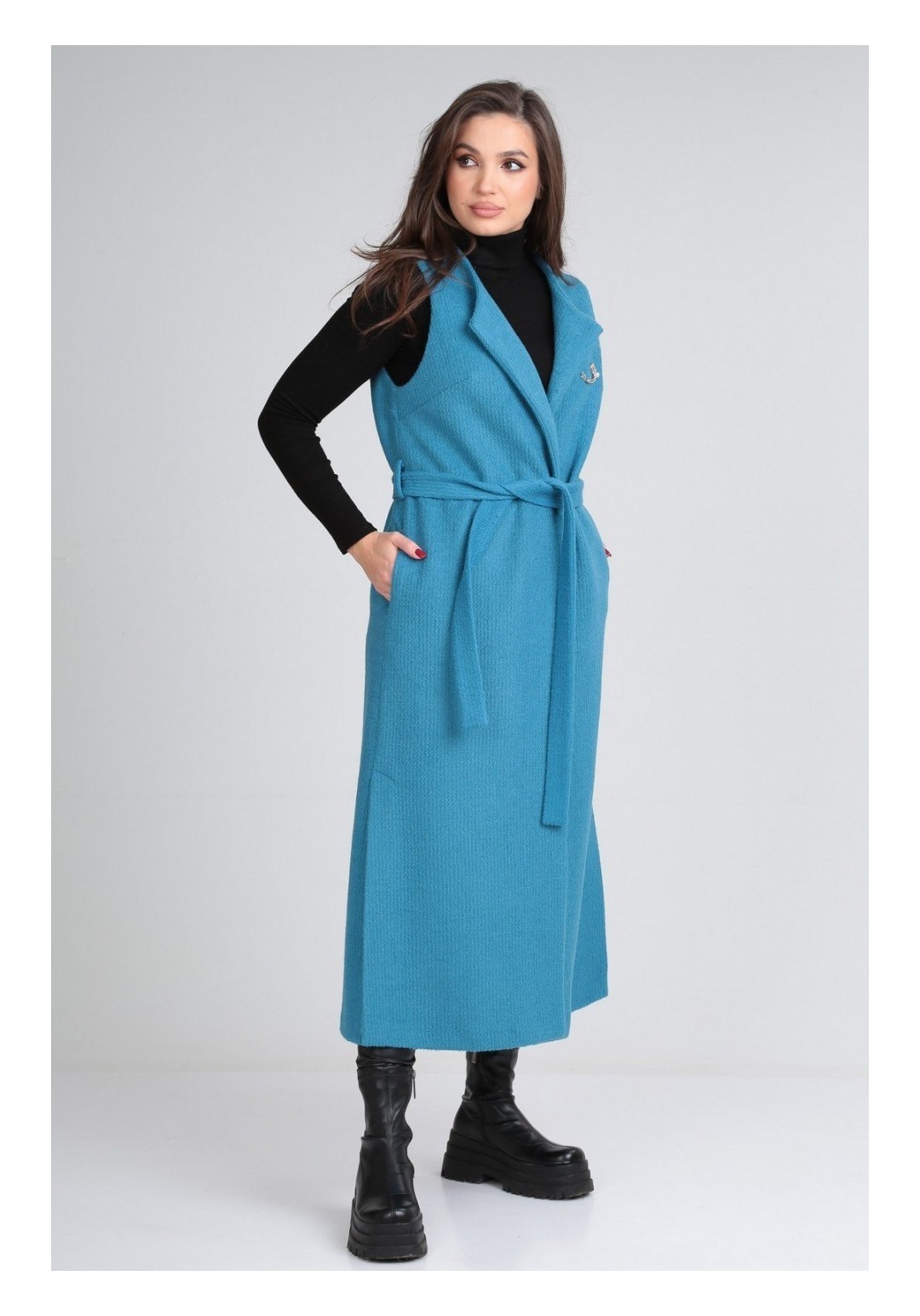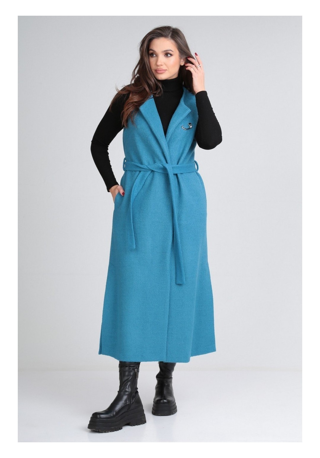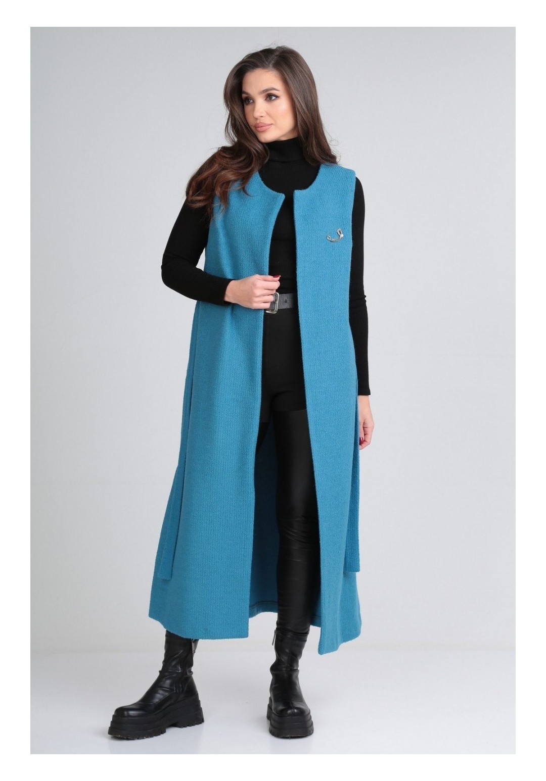Длинный жилет must have в гардеробе этого сезона. Универсальное изделие подойдет к любому стилю одежды. Можно носить как поверх худи, так и классической рубашки, водолазки; как с кроссовками, так и на шпильке. Жилет выполнен из пальтовой ткани без подкладки, в боковых швах есть функциональные карманы, а низ дополняют разрезы. В комплект входит нарядная брошка и пояс. Длина изделия по спинке 127 (+/- 1 см). Изделие подойдет на рост 170 см.