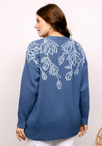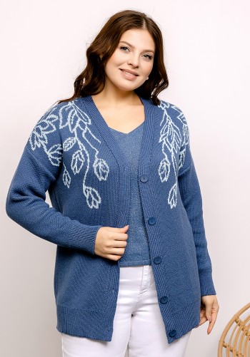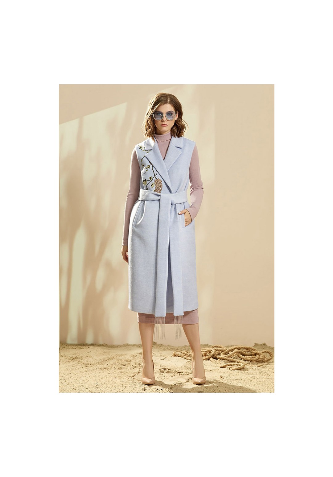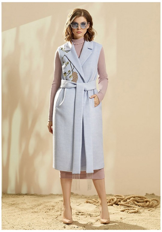 Жилет полуприлегающего силуэта на запах, длиной ниже линии колена. Изделие без застежки. Воротник пиджачного типа. Жилет с нагрудными вытачками и прорезными карманами. Спинка со средним швом. Изделие со съемным поясом, который декорирован отделочной тесьмой. Декор - шикарная вышивка "Гроздья винограда".
